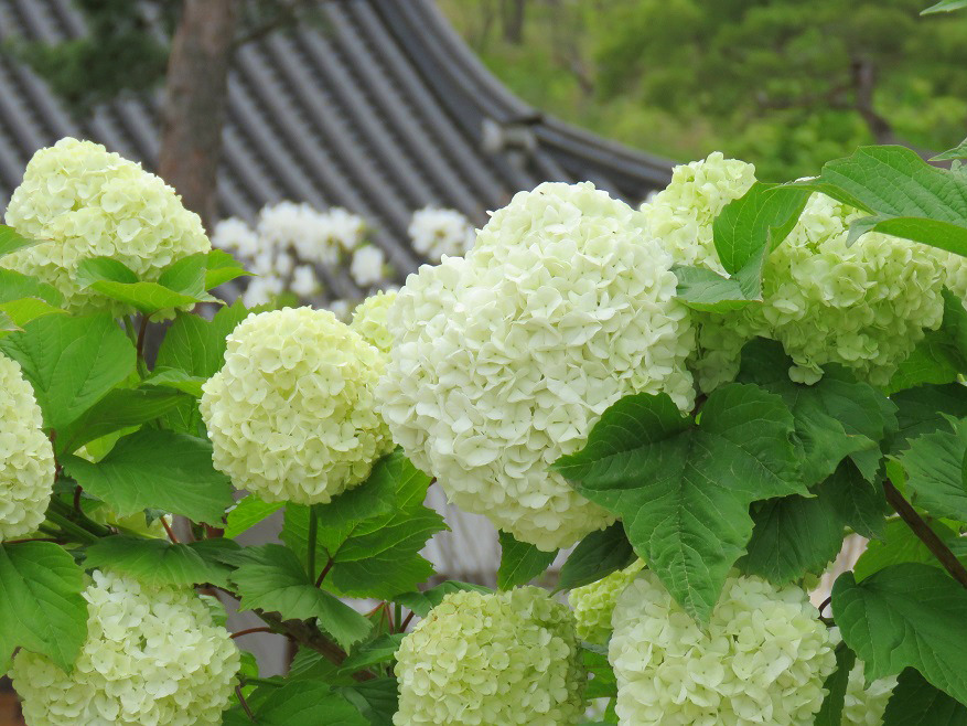 아래가 불두화로 잎이 수국과는 다른 모양(세 갈래)이다.
