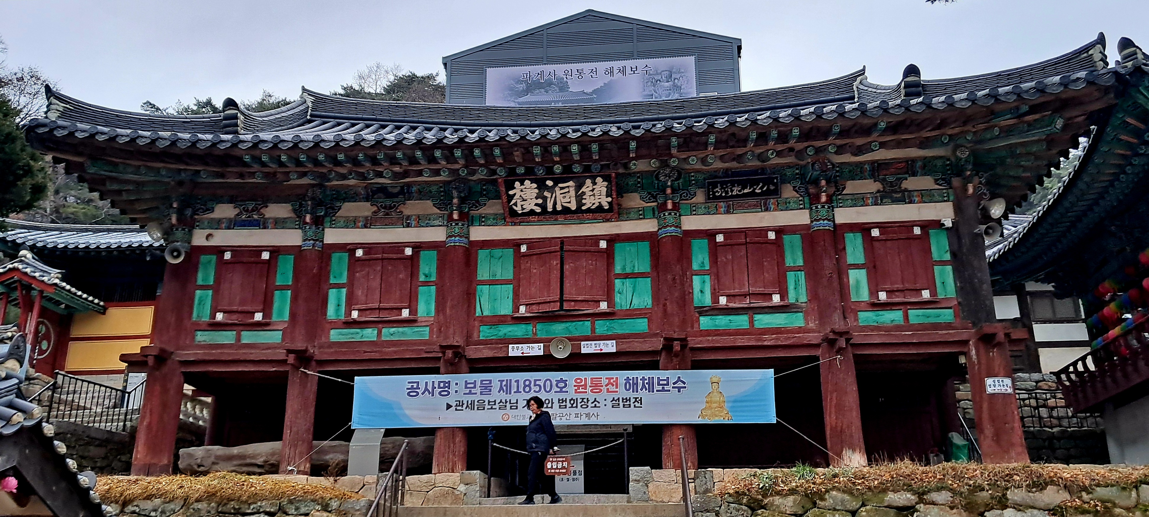 원통전을 해체하여 보수하는 佛事가 진행 중이다.이것이 완공되어 더 상세히 보면 파계사의 진면목을 볼 수 있겠다.