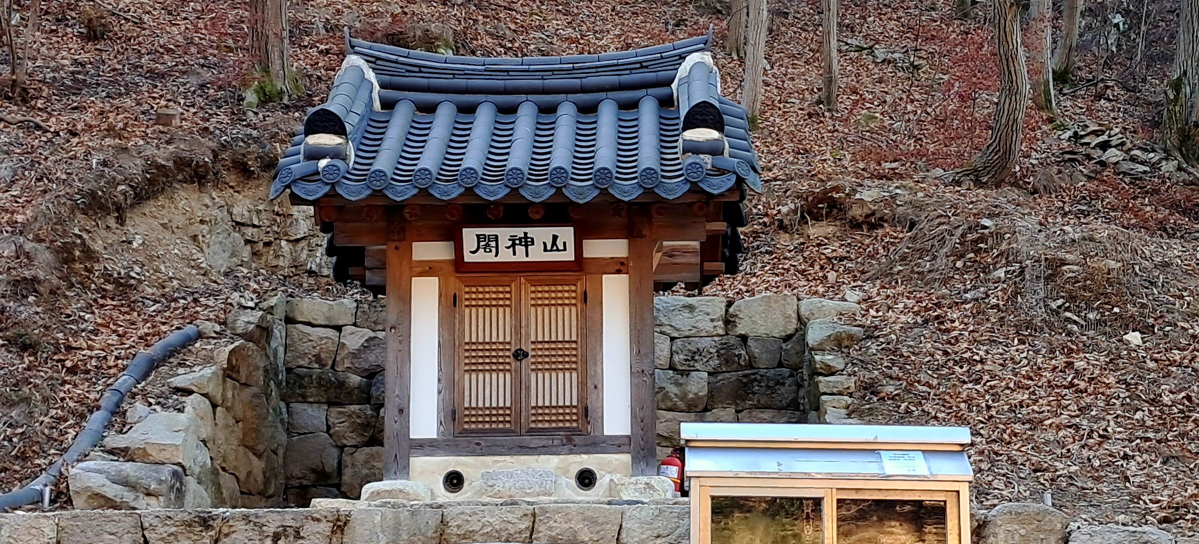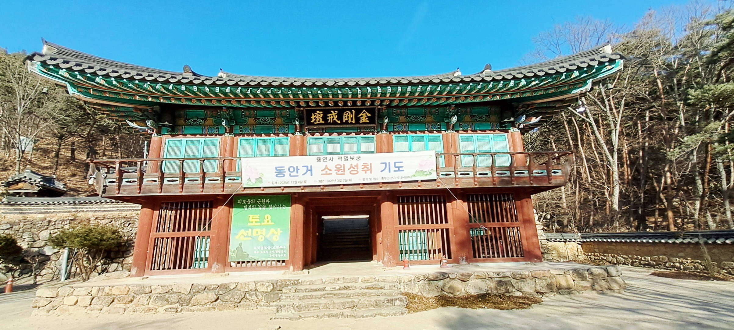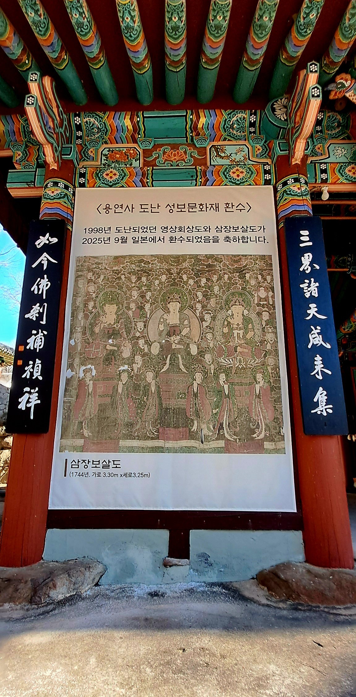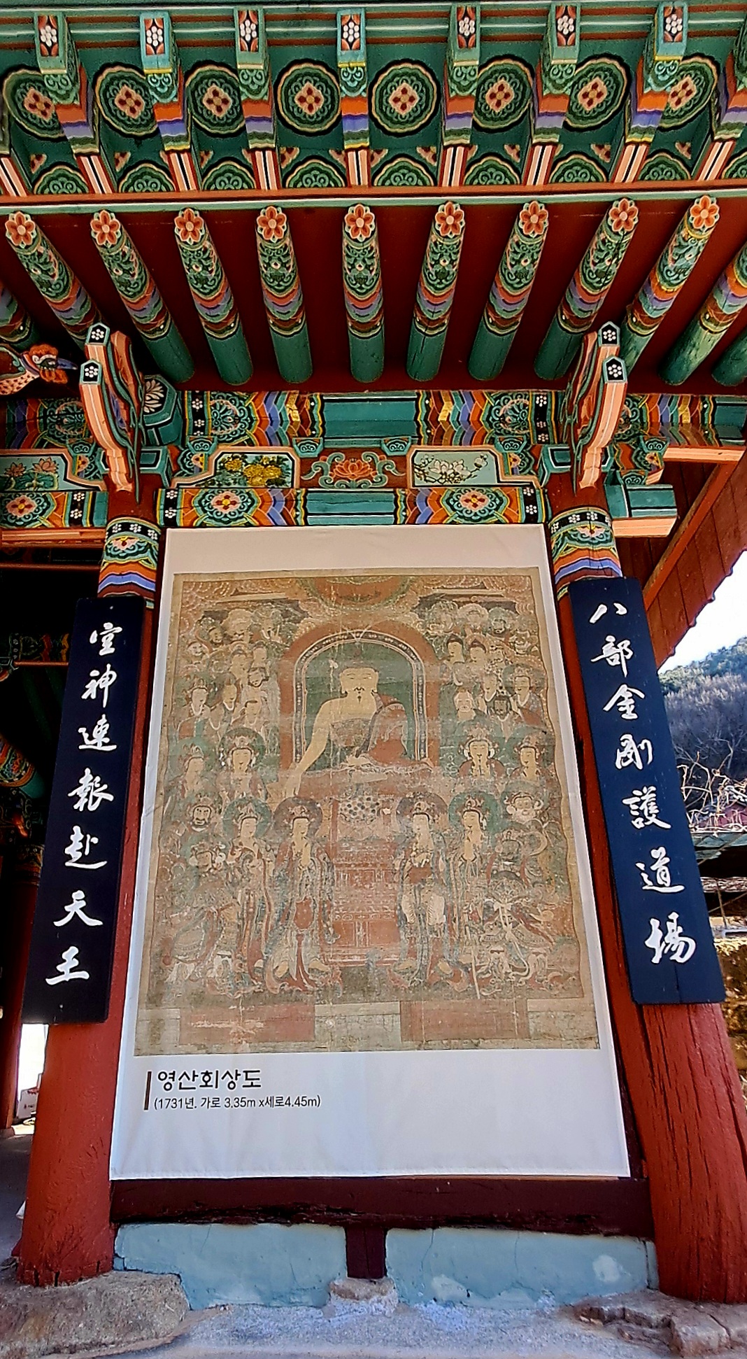 천왕문과 천왕문에 걸린 영산회상도(1998년 도난되었던 것을 2025년 일본에서 환수되었다고 적혔다)
