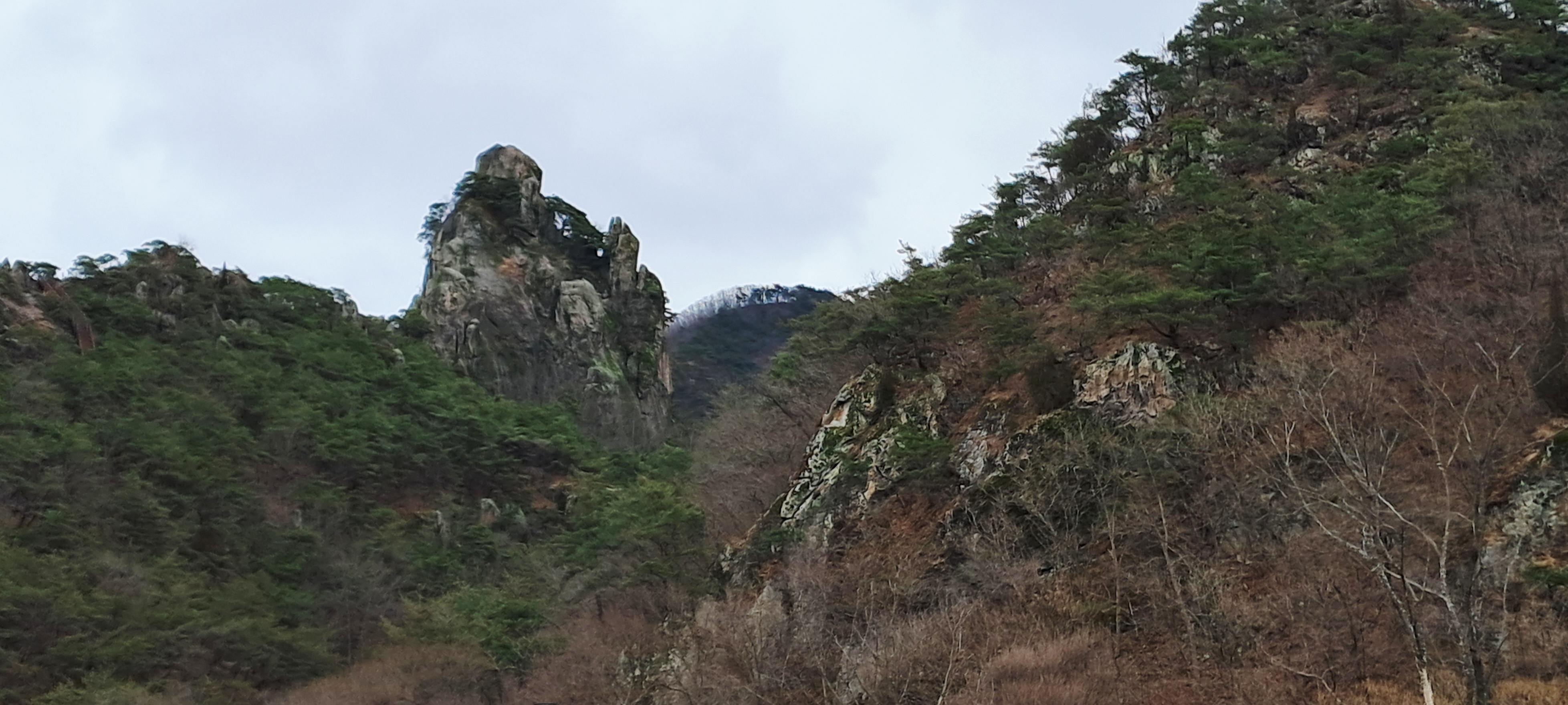 전설에 나오는 오리는 아래 사진 중간의 기와 지붕처럼 생긴 峨嵋峰에서 뒤에 있는 산신각까지 날아서 왔다는